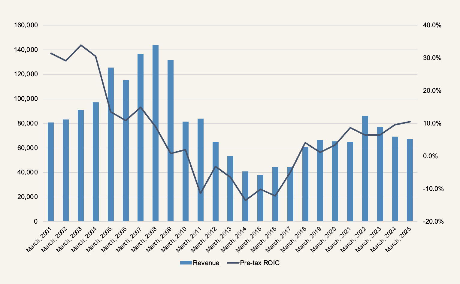 With this in mind, Deswell’s business has been a rollercoaster since its founding in 1987. Pre-GFC, it earned excellent returns on the underlying business, surfing China’s outsourcing boom when there was enough cake for everyone. But as with many other Chinese manufacturers, the GFC marked a turning point for Deswell, with sales plummeting from a high of $143mn in FY08 (Deswell’s fiscal year ends on March 31) to $38mn by FY15, mostly driven by retracted volumes from a couple of large customers (Digidesign and N&J Company) whose own sales tanked. A hodgepodge of demand shocks, rising labor costs, intensified competition, supply chain issues, regulatory pressures, and negative operating leverage took profits on a tailspin and pulled an okay gross margin in the low 30s in FY04 down to ~11% by FY15. From then on, Deswell started seeing gradual upticks in sales, now reaching $68mn by FY25, but even though Deswell has ridden a depreciating RMB (in which it pays most labor costs) against the USD and HKD (in which it generates most sales) over the full period from 2015 till today, margins never recovered to their former glory. Operating profits have improved with scale and restructurings, but are still a way off the 2000s peak, a level which they’ll probably never reach again. This long history is key to sizing up Deswell as a net net. Here’s its sales and returns on capital going back to 2001: