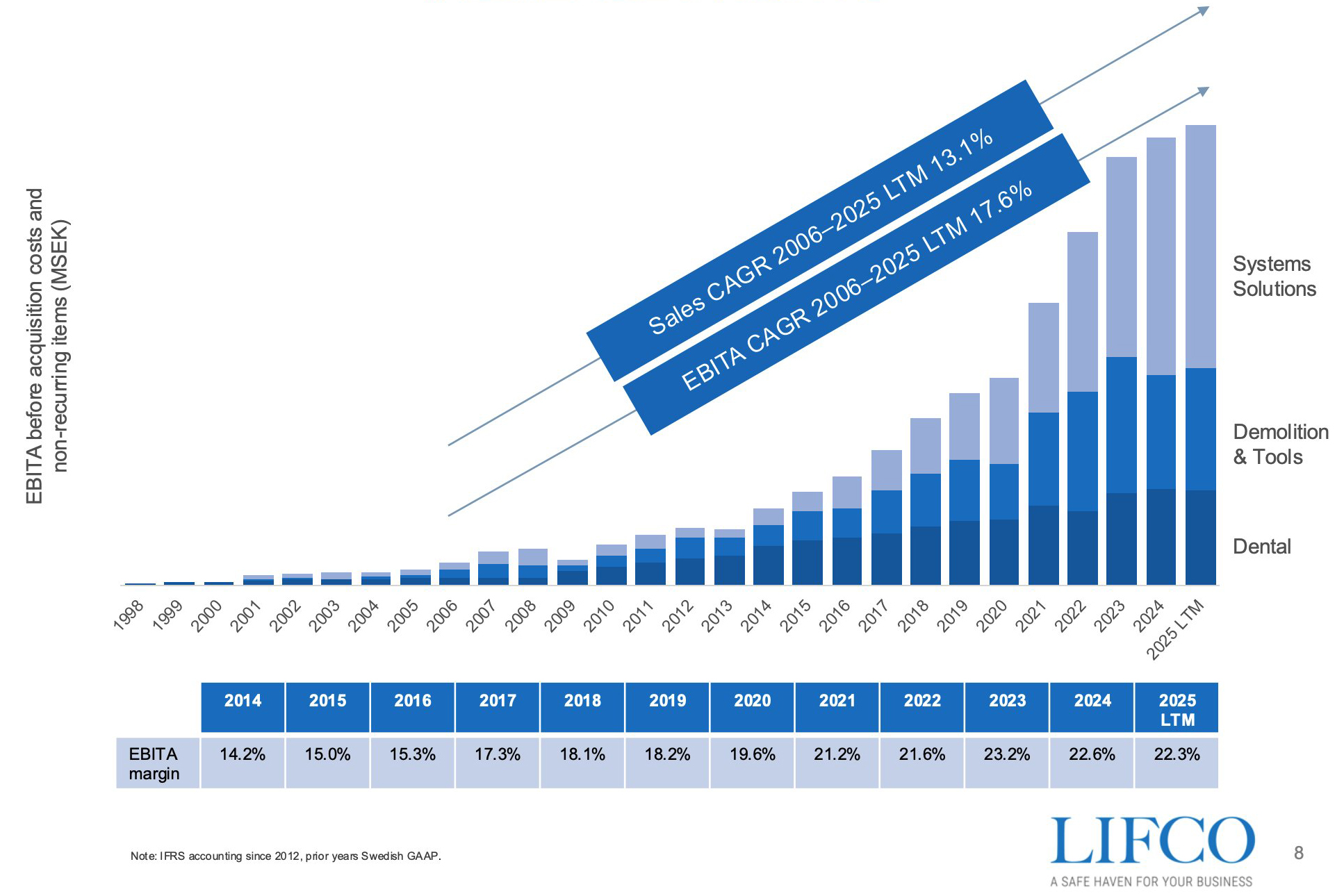 Originally founded in 1946 as a central purchasing entity for medical equipment in Sweden, Lifco’s real history ignited in the 1990s. After a short stint as a division of the publicly traded Getinge Group, it was spun off to shareholders in 1998. Two years later, following a rocky stretch, Carl Bennet, Getinge’s majority owner, took Lifco private under Carl Bennet AB. The deal was a bargain. He paid EUR30mn for the business, divested its food remedy segment, and recouped his entire investment. More assets were sold off and subsidiary managers replaced, leaving Lifco with its dental products distribution business.