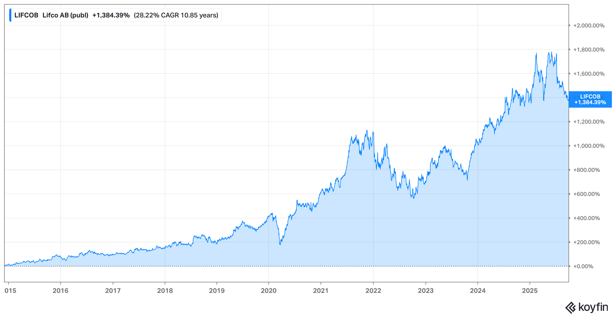 Karlsson’s move, multiplying the M&A runway many times over through diversified verticals, was a triumph. Between the spin from Getinge in 1998 till 2019, when Karlsson left Lifco, the company compounded operating earnings by a startling 18.4% per year while paying a dividend. From 2014, when Bennet took Lifco public for the second time, to 2019, the stock cranked out a 32% compounded annual return including dividends (paying out roughly one-third of earnings annually). And it has continued to be a home run under Waldemarson, delivering a full compounded total shareholder return from 2014 till today at 28% annualized on the back of a 20% EBITA CAGR, dividends, no change in share count, and a doubling of the multiple. Bennet’s stake (50.2%) is today worth a staggering SEK75bn ($8bn).