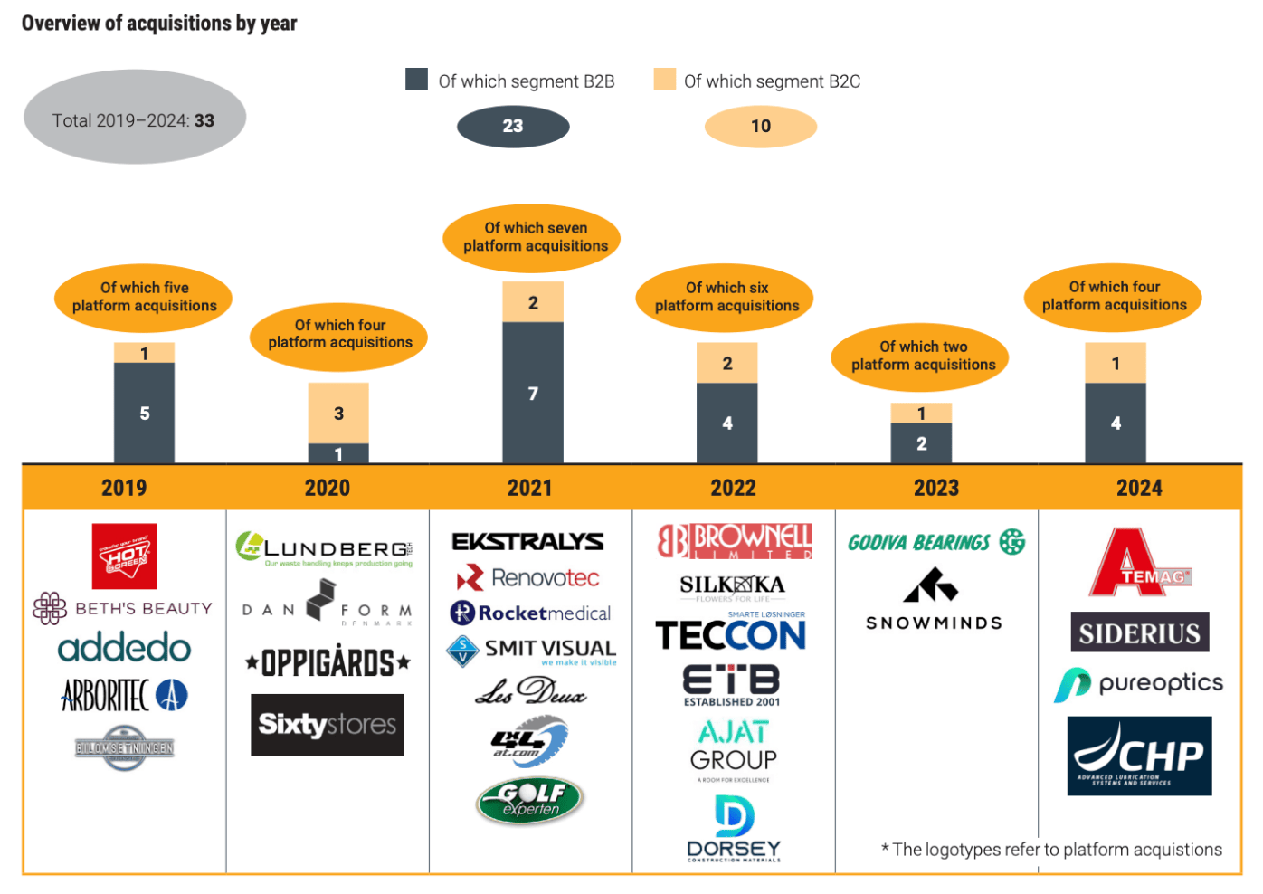In its debut year, Röko sealed six acquisitions. The second year brought four more, pushing into Denmark and the UK. Then came nine acquisitions in 2021, moving into the Netherlands, alongside two new board additions bringing the total to five. By 2022, Karlsson and Billing geared up to accelerate the M&A engine, returning to original investors to ask for more money. Everyone increased their commitment pro rata, netting another SEK1.1bn. In the summer of 2023, Röko then raised another SEK700mn through a rights issue with 96% of shareholders participating and an oversubscription of 220%. Trust was plentiful. From 2019 to 2023, Röko amassed SEK4.5bn in total capital. Since inception through today, Röko has deployed >SEK8bn across 29 platform acquisitions (34 including add-ons), with 14 rooted in the Nordics and the balance scattered across the UK (8), Netherlands (4), Germany (1), Belgium (1), and France (1).
