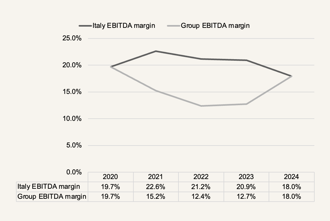 …France mostly explains the gap, because I stripped France (which Lindbergh exited last year) from the consolidated figures. Entering France was a big but expensive swing, leading consolidated margins to nosedive, and perhaps causing the market to deem the company more cyclical than is the case just by glancing over the 2021-2023 period. Lindbergh tried everything: outsourcing drivers first, then building out the distribution network, rationalizing suppliers, onboarding and synchronizing T-Linq, then slashing costs. Corradi even pulled his Italian roots to relocate to France for six months, learning the language. But faced with more competition than in Italy from the likes of Sterne and Ciblex, efforts barely tipped to critical mass before management decided this was too hard and pulled the plug, selling off the business unit in 2024 to Sterne for pocket change at an expected consideration of €1.2-1.5mn, or 0.13x trailing sales (vs Lindbergh itself currently trading at 1.8x).