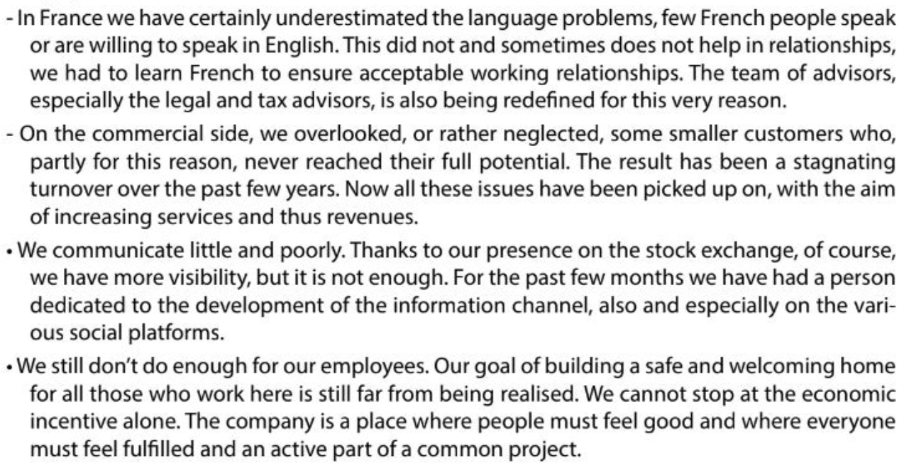 There are two ways to view the French venture: It was a mistake, a costly one at that. (Just in FY21, when Lindbergh fully consolidated the JV, capex including leases and intangibles jumped to >€4mn, up from ~€400k in FY20.) Yet, since Lindbergh took over the money-bleeding JV, management still pulled off an EBITDA margin improvement from -14.4% to 0.4% by FY23 and was despite sunk costs and commitment bias rational enough to dispose of the unit when realizing it couldn’t replicate the Italian business. This takes discipline. As Corradi put it: