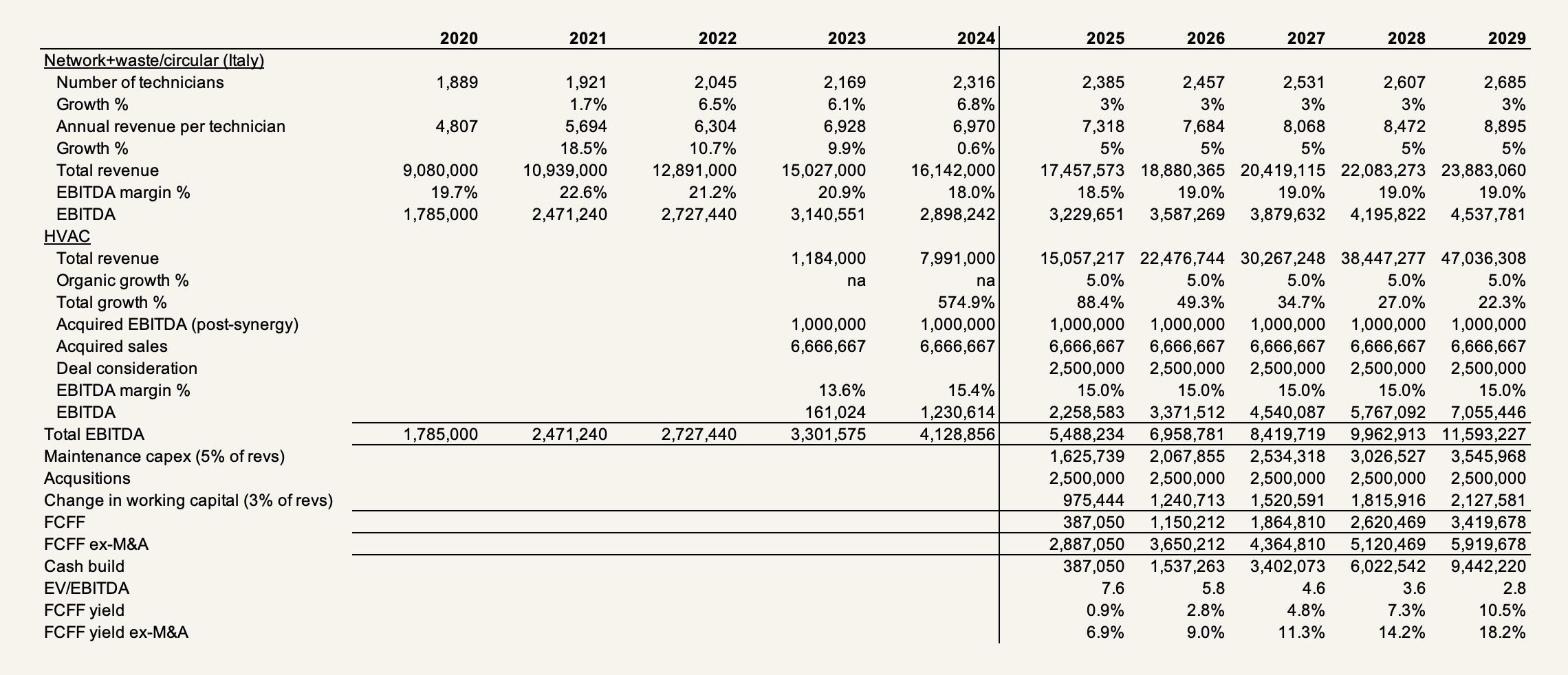 For this two-sided business — one moaty with moderate growth and one rapidly growing but less defensible — you’re paying a slightly above-average 19x EV/EBIT versus a 15x median for the whole Italian market, but if you adjust for acquired intangibles to get closer to Lindbergh’s real maintenance capex, the multiple jumps back in line with the median. That’s certainly attractive given the reinvestment returns and runway. If I weren’t a penny pincher and quite wary of jumping into just about any serial acquirer dependent on a deal environment not changing dramatically, I’d say that the below assumptions look plausible and that one, provided no hiccups, could make some money here. (My assumptions include 1ppt margin expansion/mean reversion in network+waste/circular to keep things simple, though you could argue that this is conservative and that revenue per technician-driven growth in the mid-single-digits percentage should add further operating leverage.)